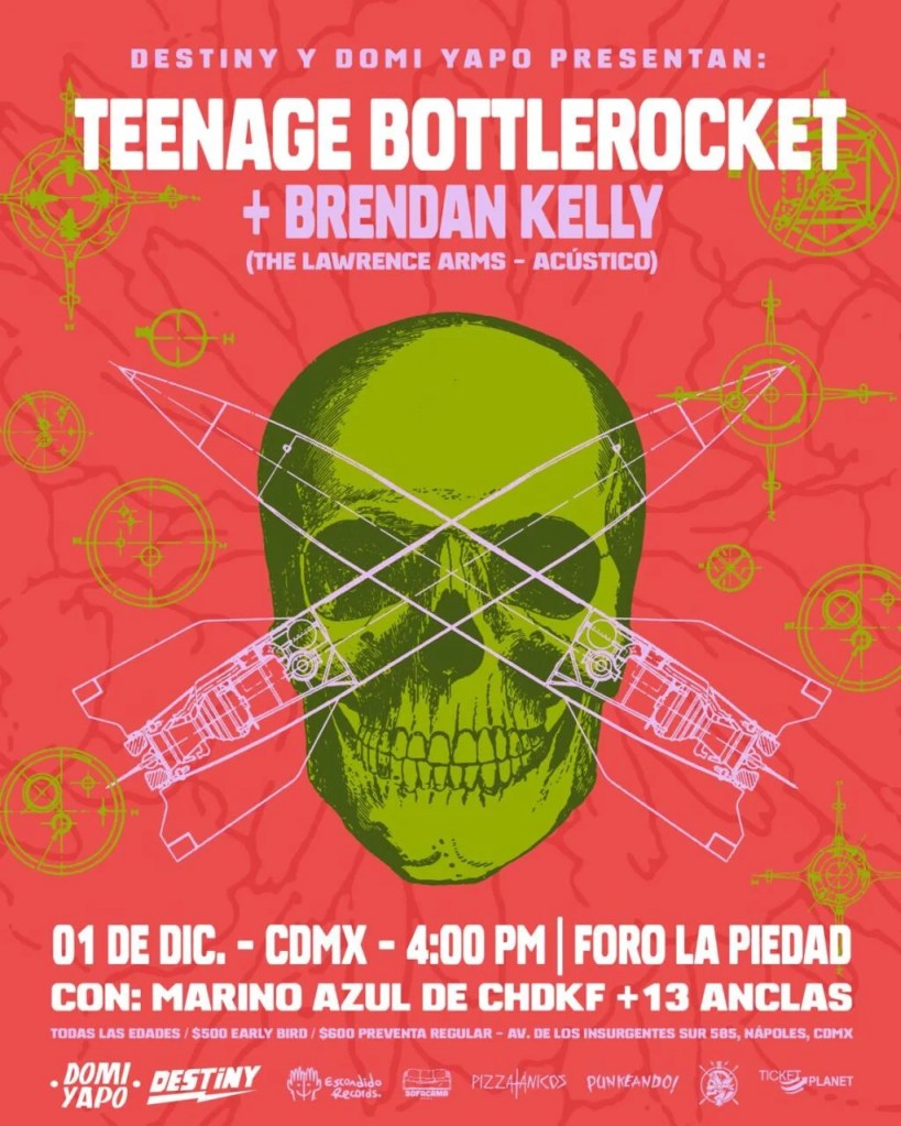 Y si no fuera suficiente con Teenage Bottlerocket, el show también contará con un atractivo adicional: la participación especial de Brendan Kelly, vocalista de The Lawrence Arms, quien presentará un set acústico que promete ofrecer una experiencia íntima y memorable. También se sumará al evento Marino, bajista y vocalista de Chingadazo de Kung Fu, así como la emergente banda mexicana 13 Anclas, que traerá su energía fresca al escenario.